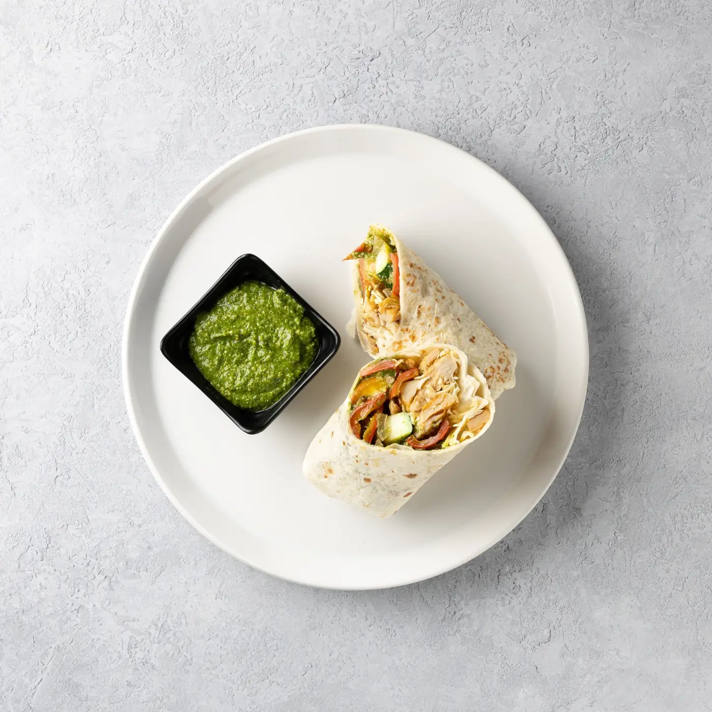 Sočna pileća tortilja s batkom i zabatkom, uz tikvicu, papriku i luk, obogaćena aromatičnim pesto umakom i sirom.