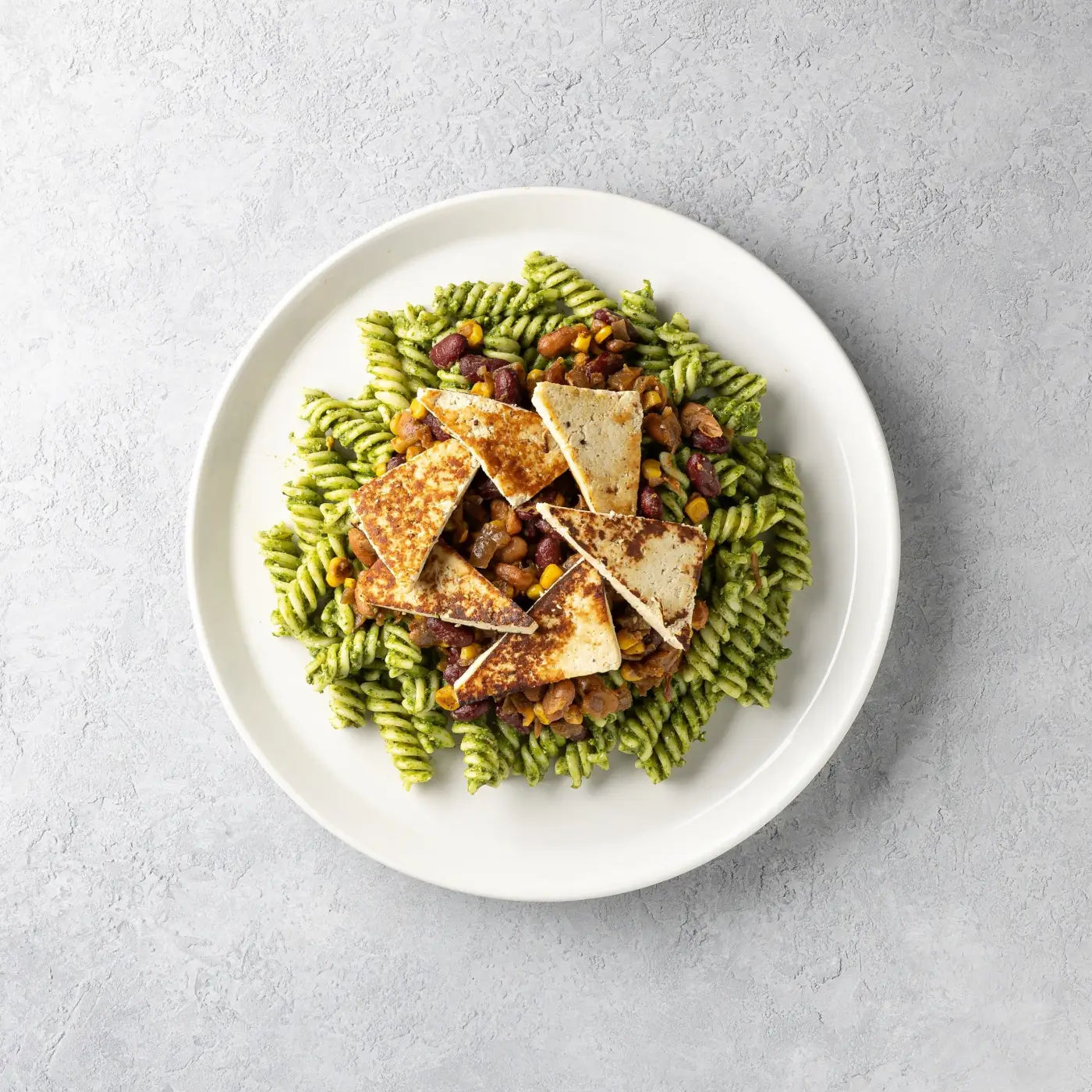 Marinirani tofu poslužen uz tjesteninu u aromatičnom umaku od bosiljka, rikole i baby špinata, i našu pikantnu meksičku mješavinu povrća.