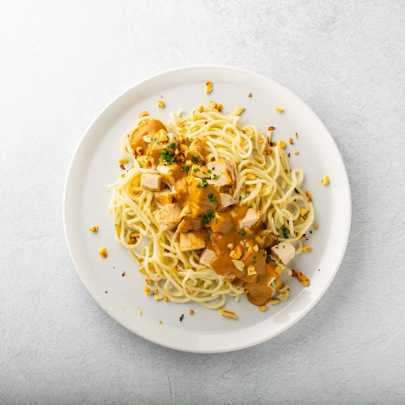 Mekani i sočni pileći file poslužen uz rezance u pikantnom i aromatičnom umaku na bazi kikiriki maslaca i soje.